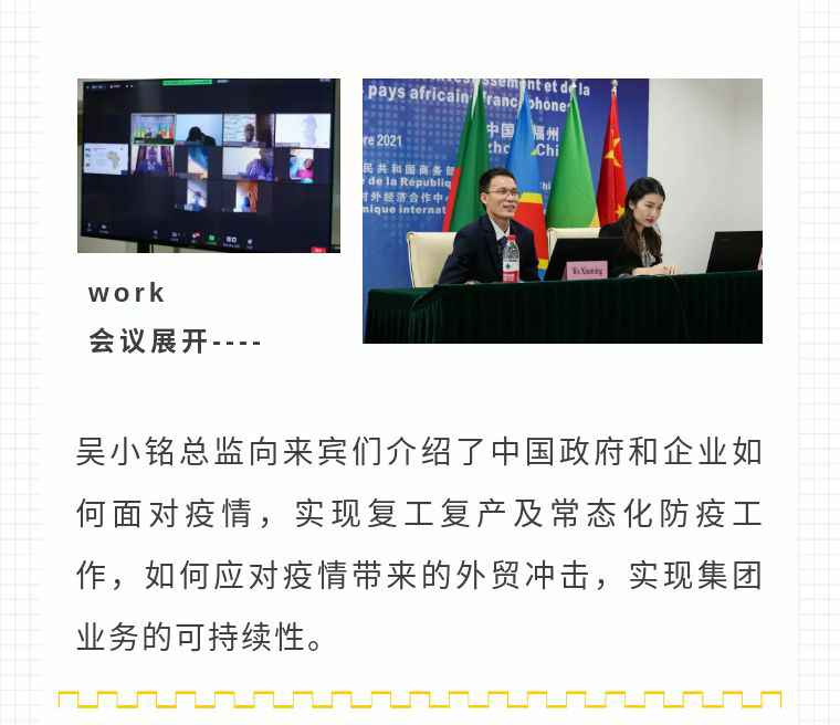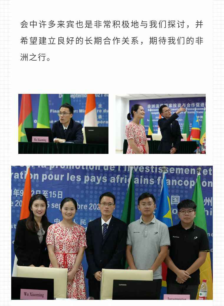 2021年9月6日,三亚常天线上书店经营有限公司应福建省对外经济合作中心邀请,由非洲大区市场总监吴小铭作为代表与包括25位来自非洲法语国家经贸、投资促进政府部门官员及企业管理人员就疫情下中国企业如何应对机遇与挑战展开讨论。